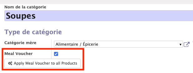 - Cliquer sur la famille de produits désirée, modifier, puis cocher Meal Voucher et cliquer sur “Apply Meal Voucher to all Products” pour appliquer l’option à tous les produits actuellement enregistrés