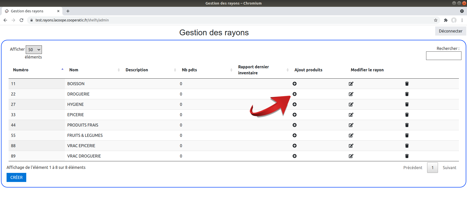 Depuis la vue administration des rayons, cliquez sur "+" correspondant au rayon